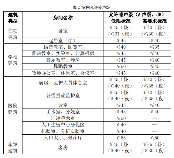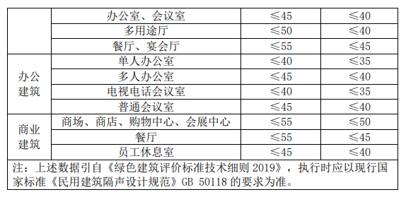 4、采取措施優(yōu)化主要功能房間的室內(nèi)聲環(huán)境。噪聲級(jí)達(dá)到現(xiàn)行國(guó)家標(biāo)準(zhǔn)《民用建筑隔聲設(shè)計(jì)規(guī)范》GB 50118 中的低限標(biāo)準(zhǔn)限值 和高要求標(biāo)準(zhǔn)限值的平均值。詳情看下表。