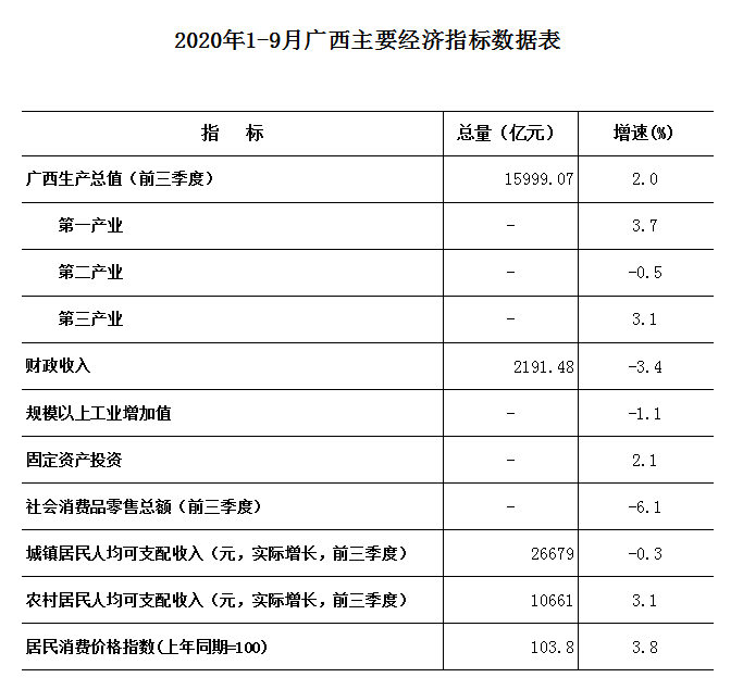 2020年1-9月廣西主要經濟指標數據表如下↓↓