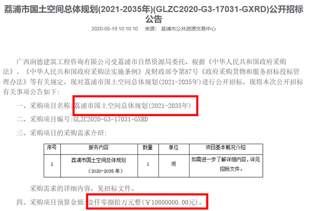 而2020年5月19日,荔浦市國土空間總體規劃(2021-2035年)也公開招標了,預算金額1080萬元。