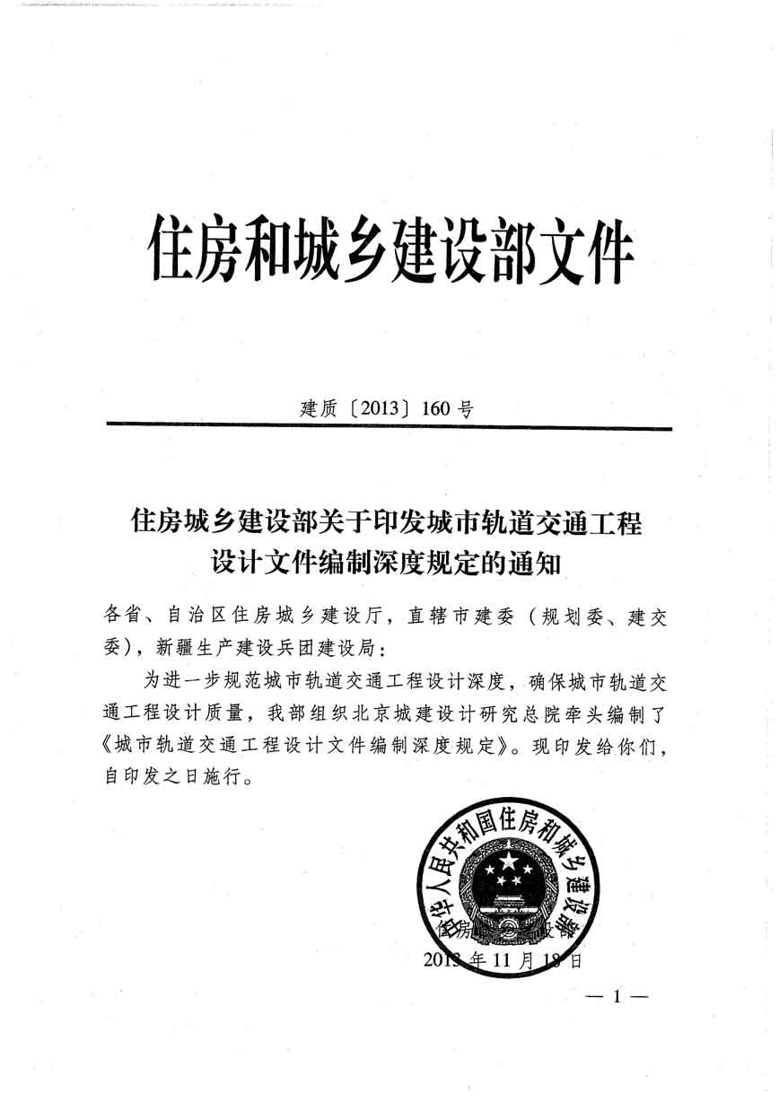 為進(jìn)一步規(guī)范城市軌道交通工程設(shè)計(jì)深度,確保城市軌道交通工程設(shè)計(jì)質(zhì)量,我部組織北京城建設(shè)計(jì)研究總院牽頭編制了《城市軌道交通工程設(shè)計(jì)文件編制深度規(guī)定》?,F(xiàn)印發(fā)給你們,自印發(fā)之日施行。