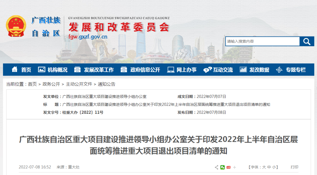 2022年7月8日,廣西壯族自治區重大項目建設推進領導小組辦公室發布
