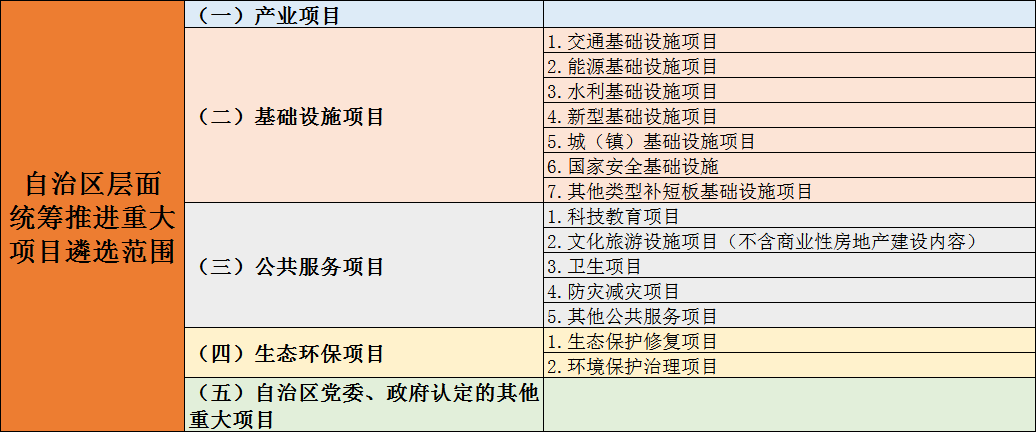 自治區層面統籌推進重大項目遴選范圍如下所示: