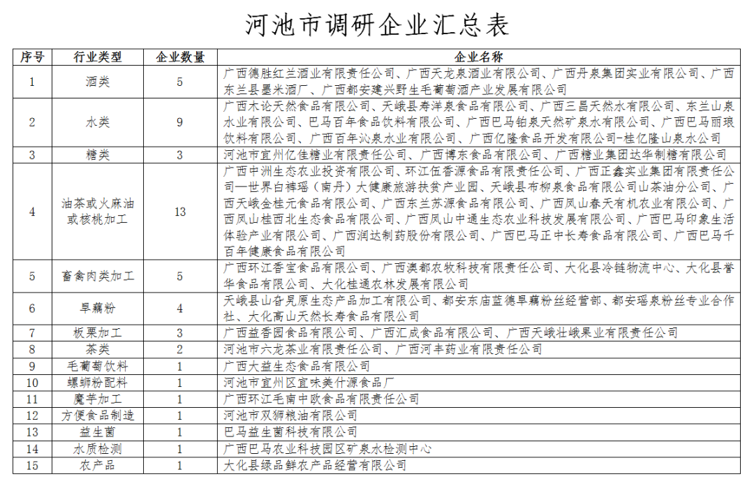 為高質量完成規劃編制工作,6月至7月中旬,我公司組織規劃編制團隊,在河池市工業和信息化局領導的帶領下,深入河池市九縣兩區各相關企業進行實地調研,并組織當地與規劃相關的部門進行座談。其中調研了酒類企業5家,水類企業9家,水檢測中心1家,糖類企業3家,其他特色食品企業類33家,共51家企業和機構。